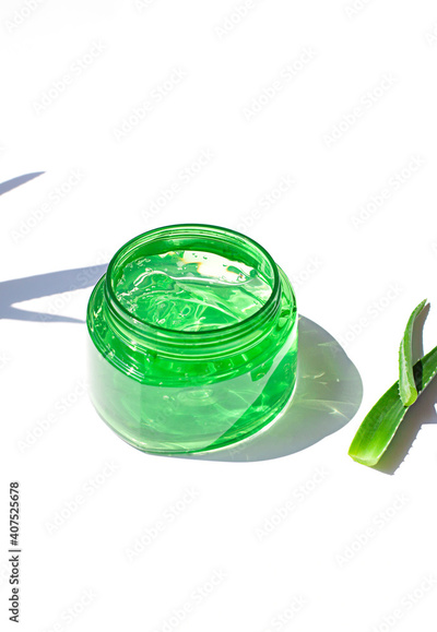 Aloe vera fresh gel in a plastic bottle close up on the white background. After sun cooling skin cosmetics