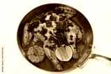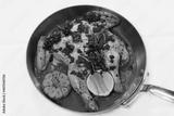 roasted spatchcock chicken in a coper pan wirh garlic and lemon
