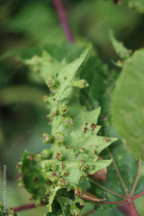 Close-up of green Wine leaf with many galls caused by parasites or insect. Vine plant with disease or illness