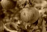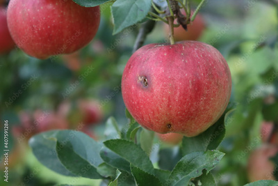 Close-up of red Gala apples with brown spots on branch in the orchard. Red apple s with disease
