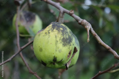 Close-up of green Granny Smith apples with disease growing on branch on tree . Malus domestica in the orchard