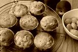 Muffins on a wire rack with peaches and italian Amaretti cookies on wooden table