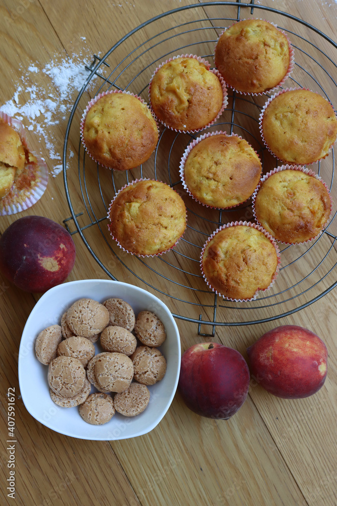 Muffins on a wire rack with peaches and italian Amaretti cookies on wooden table
