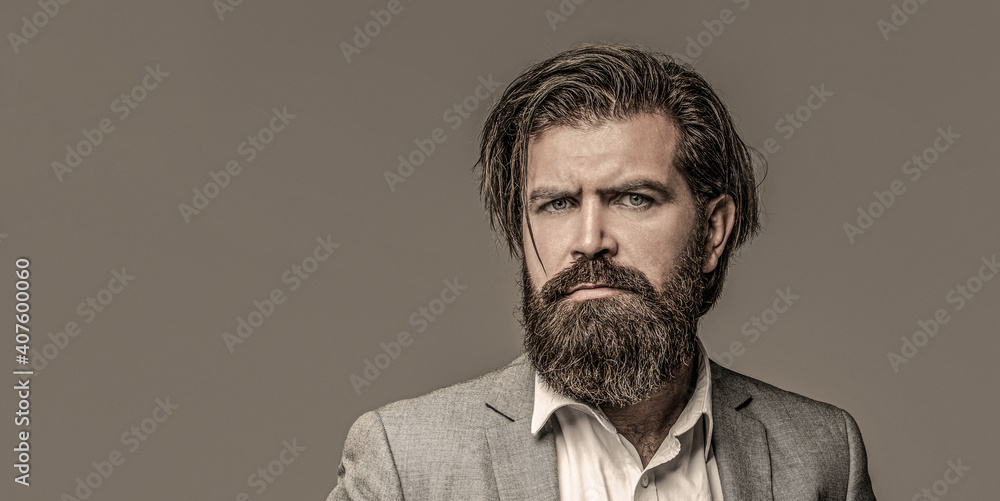 Male beard and mustache. Handsome stylish bearded man. Bearded man in suit and bow-tie. Sexy male, macho, long beard. Studio portrait of a bearded hipster man