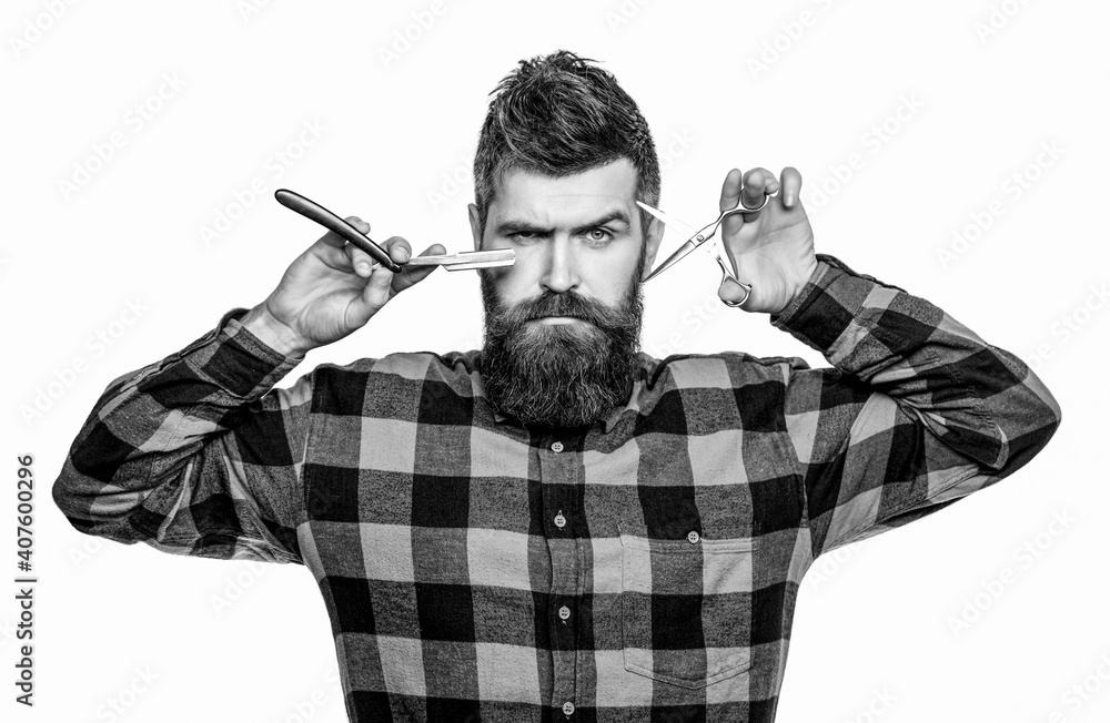 Bearded man, bearded male. Portrait of stylish man beard. Barber scissors and straight razor, barber shop. Vintage barbershop, shaving. Black and white
