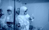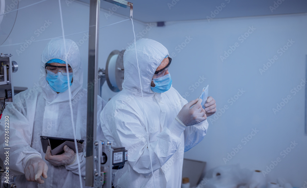 Technician worker wearing protective suite , glove are inspect ion with check face mask manufacturing process to safe and against from virus.