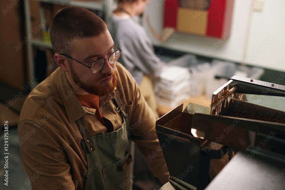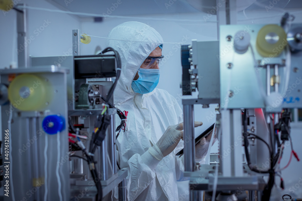 Technician worker wearing protective suite , glove are inspect ion with check face mask manufacturing process to safe and against from virus.