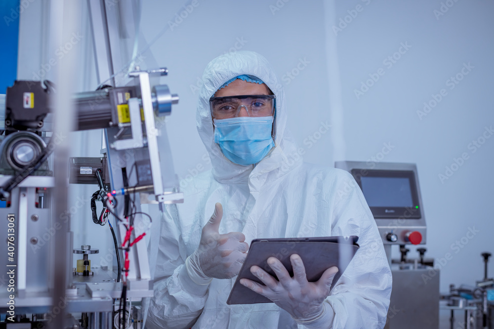 Technician worker wearing protective suite , glove are inspect ion with check face mask manufacturing process to safe and against from virus.