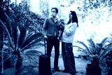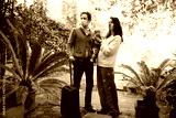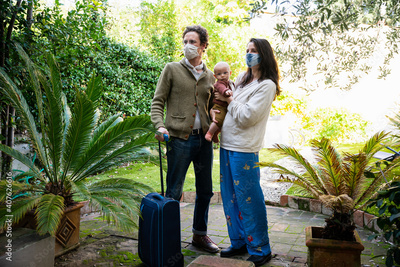 Family traveling for holidays arrives at hotel with suitcase waits in garden to access room - Father mother with child in garden of the rented apartment with face mask to protect Coronavirus Covid-19