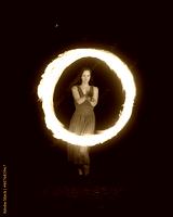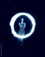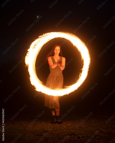 Graceful elegant red haired female fireshow performer making fire dance with two metal fans lit with flames on night mountains meadow