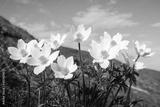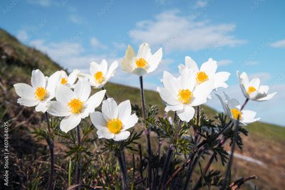 Amazing landscape with magic white flowers and blue sky on summer mountains. Nature background
