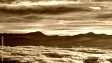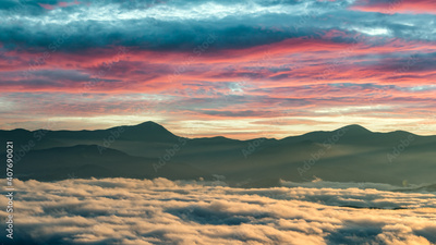Amazing flowing morning fog in spring mountains. Beautiful sunrise on background. Landscape photography