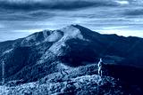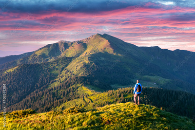 A tourist on the edge of a mountain covered with a lush grass. Purple sunset sky and hight mountains peaks on background. Landscape photography