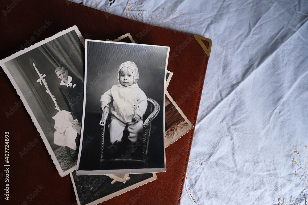old photo albums lie on white mint tablecloth, vintage photographs of 1960, concept of family tree, genealogy, childhood memories, connection with ancestors