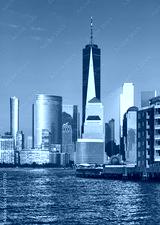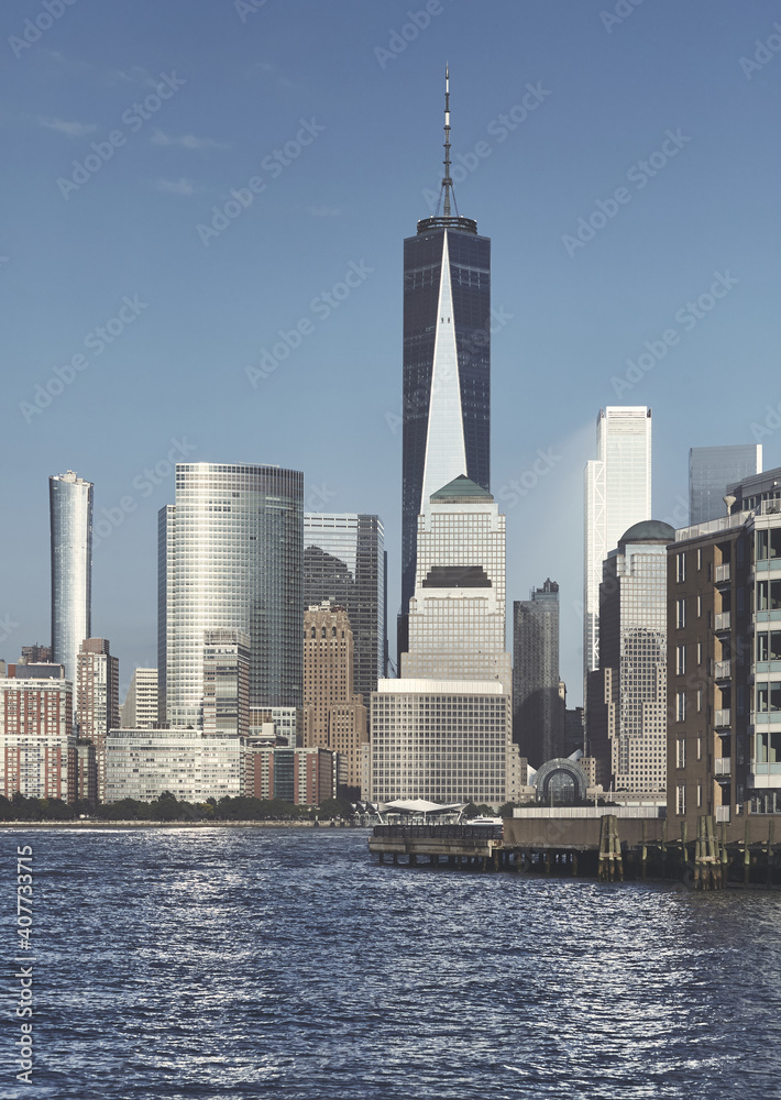 Manhattan skyline seen from Jersey City at sunset, color toned picture, USA.