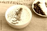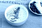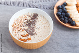 Healthy breakfast fruit smoothie bowl topped with almond, granola and chia seeds, snack banana and blueberry