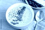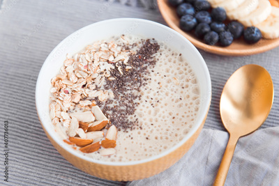 Healthy breakfast fruit smoothie bowl topped with almond, granola and chia seeds, snack banana and blueberry