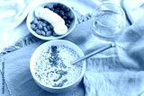 Healthy breakfast fruit smoothie bowl topped with almond, granola and chia seeds, snack banana and blueberry