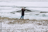 Cracked ice, lots of pieces of ice on the river. Girl is take the photo of landscape.