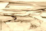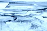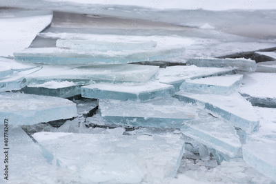 Ice hummocks on lake. Transparent turquoise ice floes on a large river.