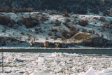 Melting crushed ice in water in nature. Swans floats on the river in sunny spring day.