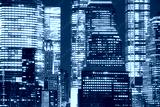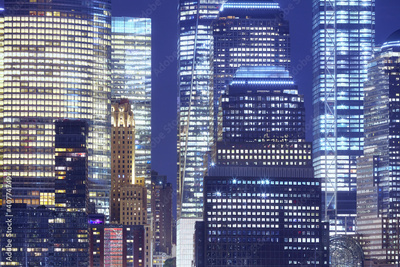 Close up picture of New York City modern buildings at night, color toning applied, USA.