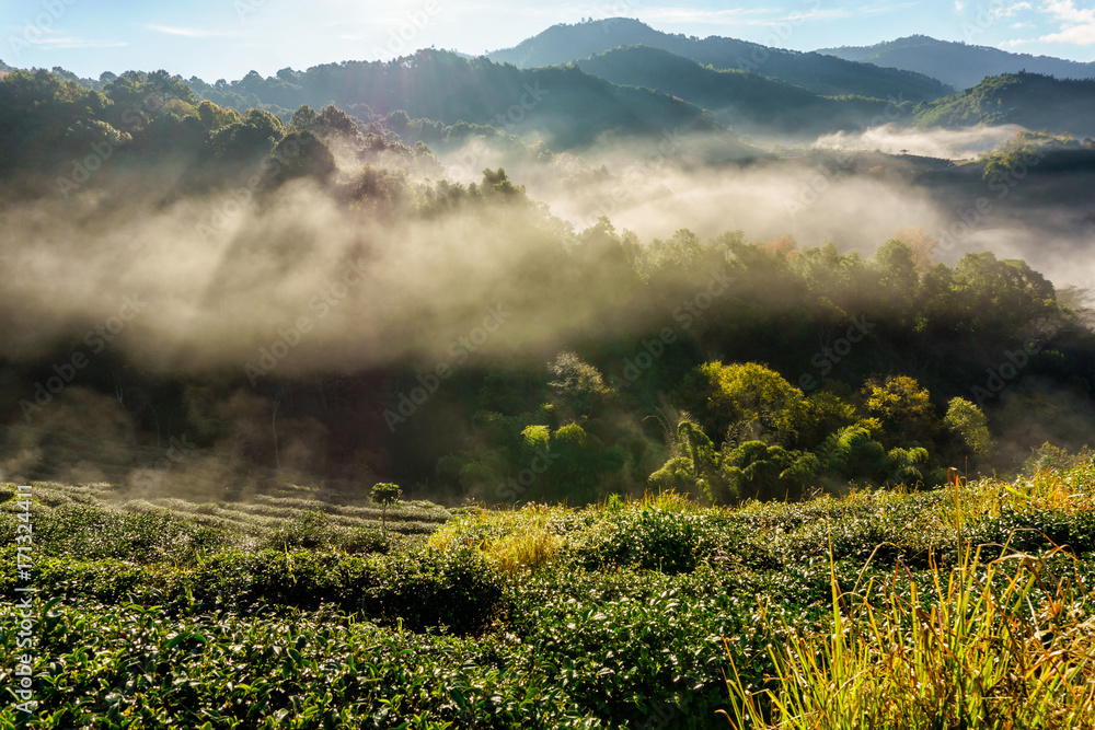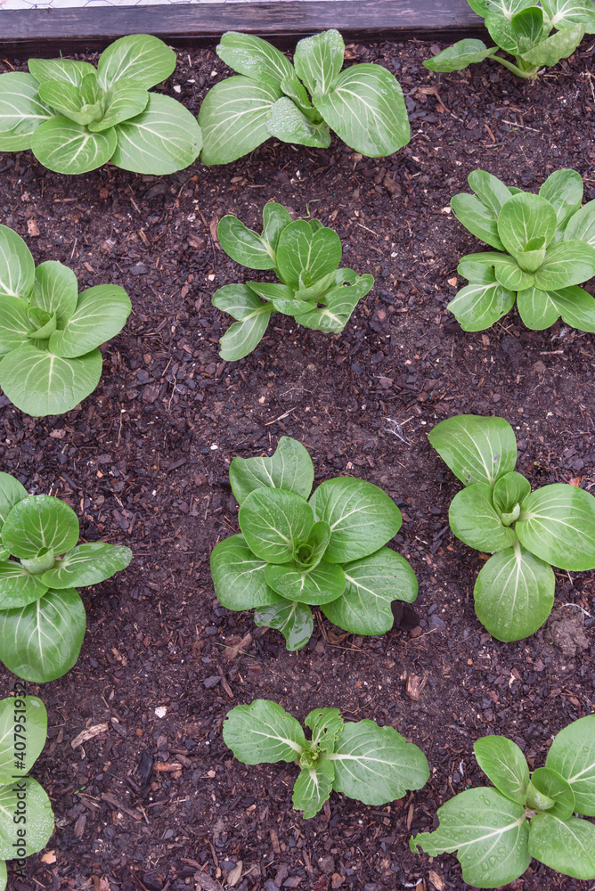 Row of bok choy leafy greens with water drop cultivated at backyard garden in Texas, USA