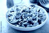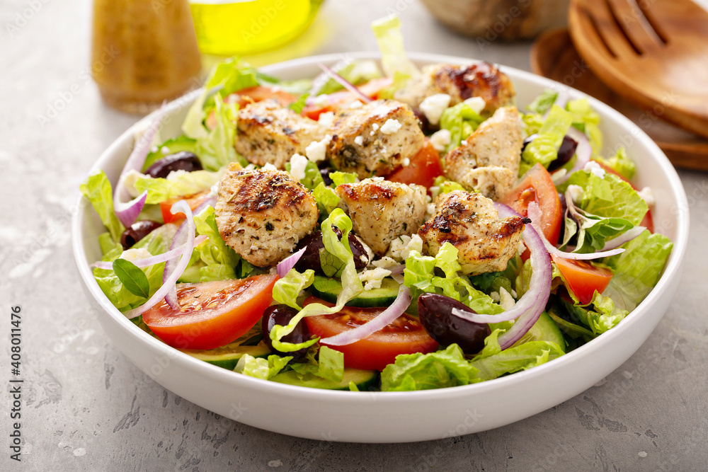 Greek salad with vinaigrette dressing topped with grilled chicken souvlaki