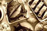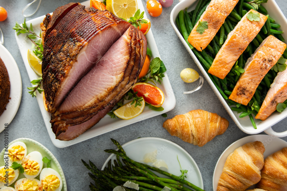 Easter brunch with spiral cut ham, asparagus and roasted salmon overhead shot