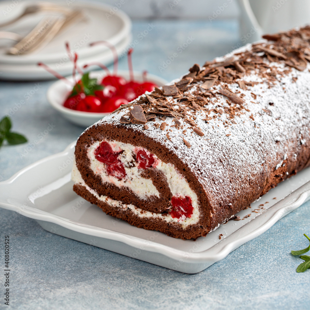 Black forest chocolate swiss roll willed with cherry and whipped cream filling