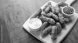 Battered Haddock fish, mini fingers with mashed peas, tartar sauce on white wooden board