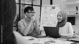 Multiracial group of young creative people in smart casual wear discussing business brainstorming meeting ideas mobile application software design project in modern office. Coworker teamwork concept.