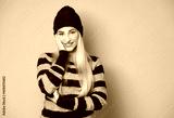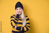 Smiling young beautiful woman looking at camera, model wearing woolen cap and sweater, isolated on yellow background. Half length of pretty girl with positive emotion, smiley expression