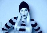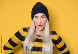 Surprised face of woman stare to camera, model wearing woolen cap and sweater, isolated on yellow background. Surprise expression face - head and shoulders of a amazed girl. Wao - omg concept