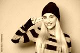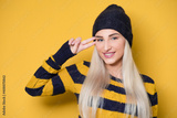 Playful woman showing peace V sing with fingers, model wearing woolen cap and sweater, isolated on yellow background. Cheerful smiling lovely woman