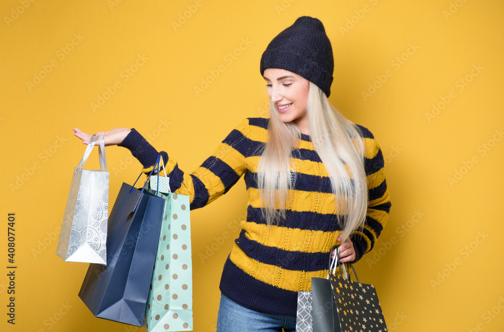 Curious young woman holding package bag with purchases after shopping, isolated on white background