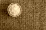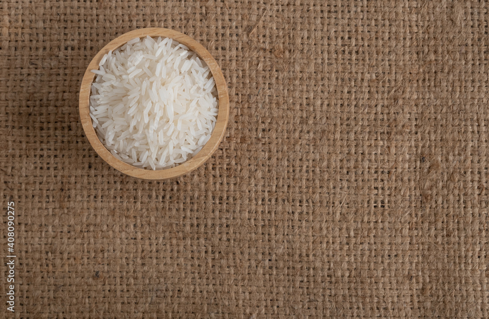 Jasmine rice in wooden bowl on Sackcloth,burlap hessian table background with copy space,top view