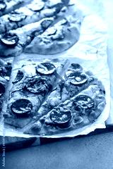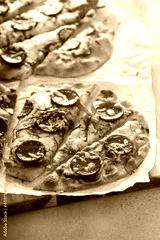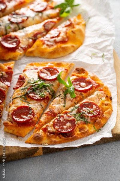 Flatbread pepperoni pizza topped with fresh basil sliced