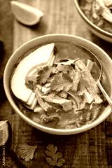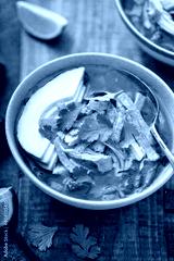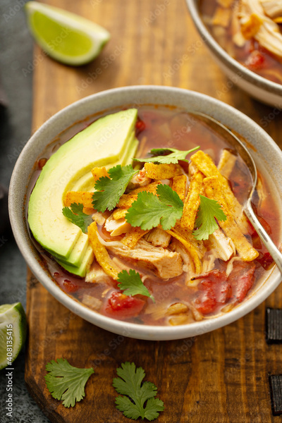 Slow cooker chicken taco soup topped with fresh cilantro and avocado