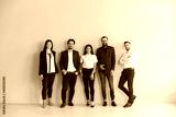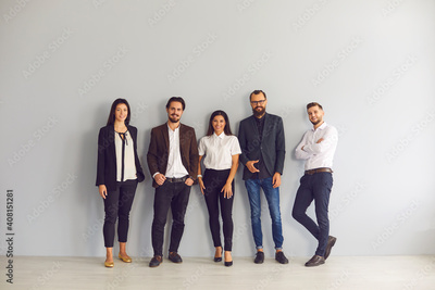Team of happy young business people in smart casual office wear standing in studio and looking at camera. Group portrait of smiling company employees, startuppers or experienced business coaches