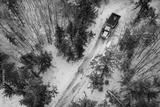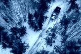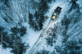 A rock truck makes it's way through pathway in a dense Canadian boreal forest.