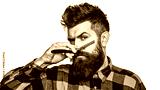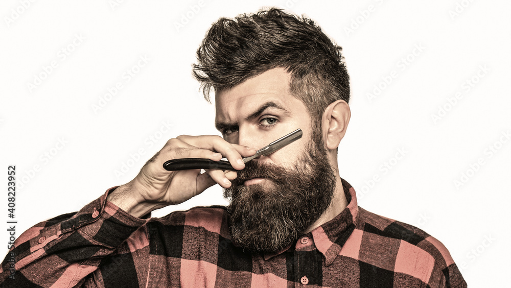 Barber straight razor, barber shop. Bearded man, long beard, brutal, caucasian hipster with moustache. Vintage straight razor