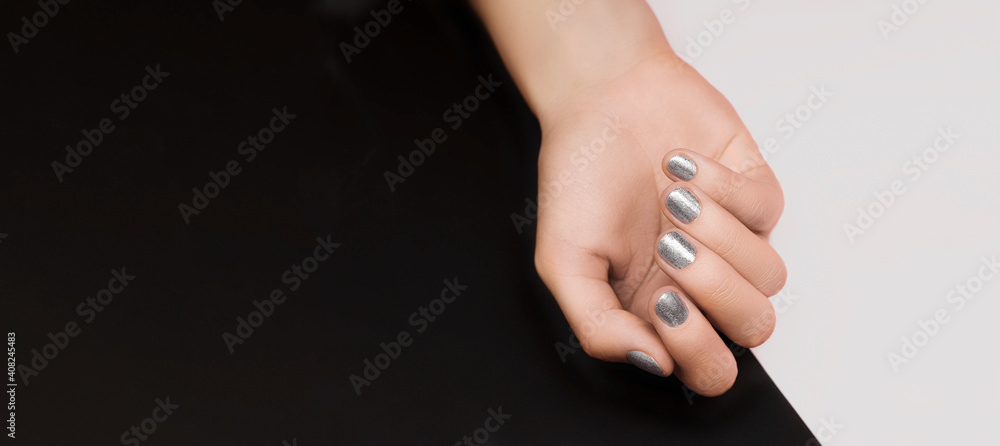 Female hand with silver nail design. Glitter silver nail polish manicure. Female hand on white black background