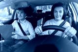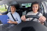 driver courses, exam and people concept - young woman and driving school instructor with clipboard in car