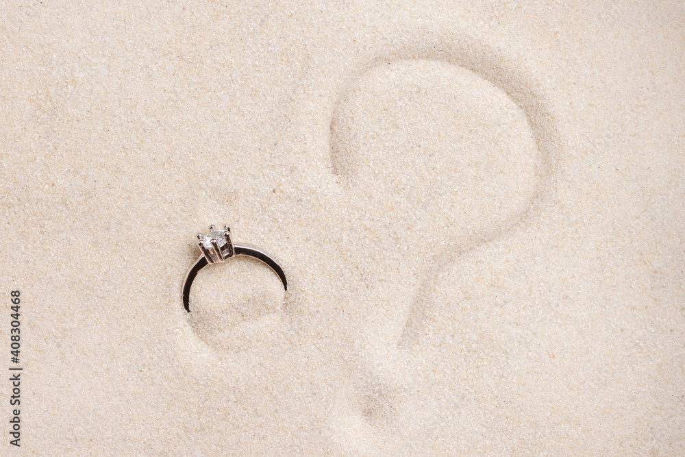 Question handwriting sign and silver brilliant ring with sand background above view for wedding romantic invitation or love story