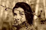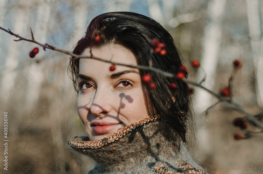 Front view close up portrait of a smiling brunette caucasian woman with a queen neck sweater, with a branch of winter berries, in a forest