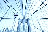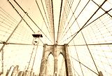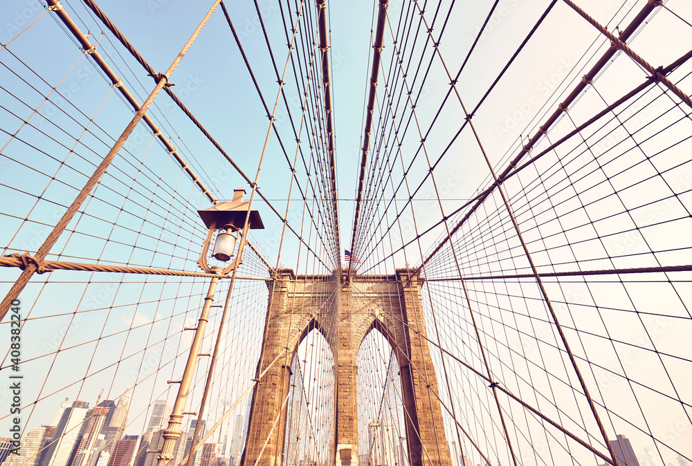 Wide angle picture of Brooklyn Bridge in the morning, color toning applied, New York City, USA.