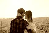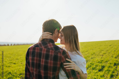 Young couple enjoying romantic happy moments outside on spring green meadow.