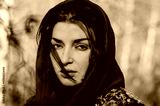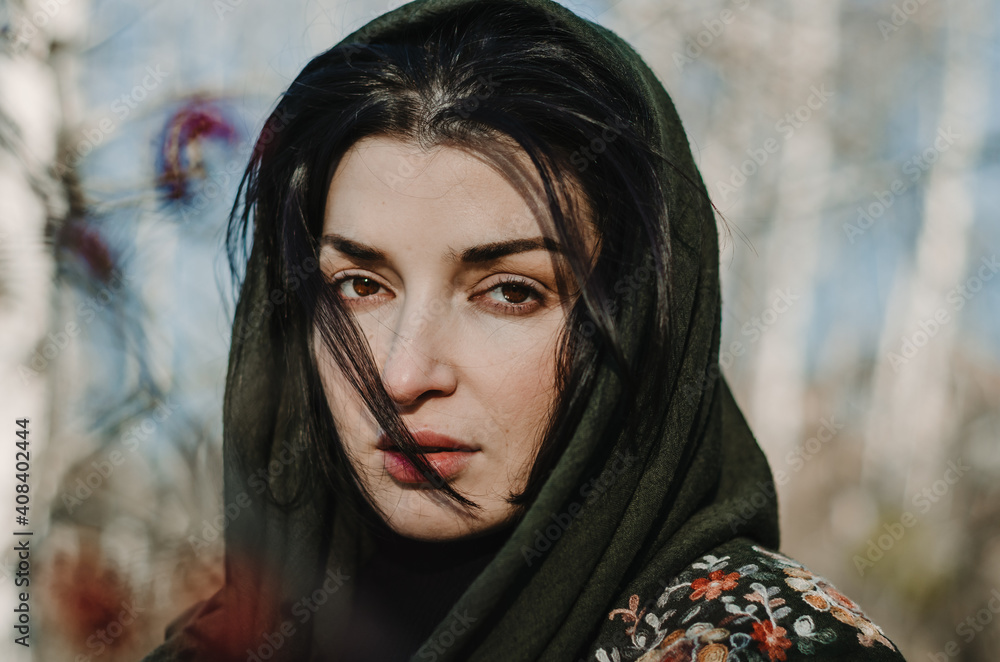 Beautiful portrait of a woman with a scarf over head, looking at camera