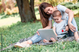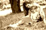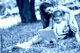 Mother with son sitting in the park and work on laptop.